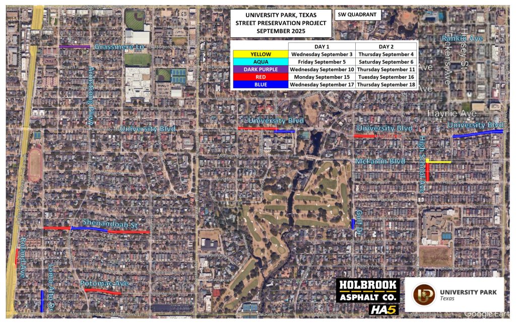 Holbrook Asphalt will be performing street maintenance in your area on behalf of the City of University Park. The product being applied is a High Density Mineral Bond called HA5. The treatment will help significantly extend the life of the streets. The benefits of properly maintained streets include higher property values, a smoother/safer ride, and reduced costs to the community by prolonging the need for replacement.